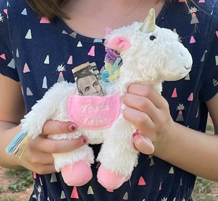 This tooth fairy is a fun and unique way to keep that important lost tooth safe for the Tooth Fairy! Each tooth fairy features a pocket to safely store a lost tooth and later the money the tooth fairy leaves.