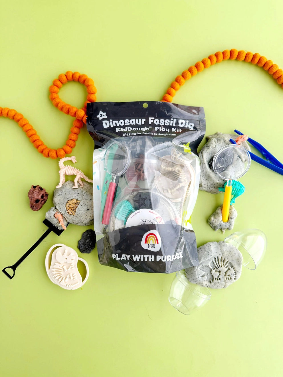 Includes: 8 oz Textured Gravel Grey (Cookies & Cream) KidDough with Fossil Charms Buried Inside, Dinosaur Bone Puzzle to Mix In and Excavate, Clear Dino Egg Form, Magnifying Glass, Tweezers, Dino Skeleton and Fossil Stamper