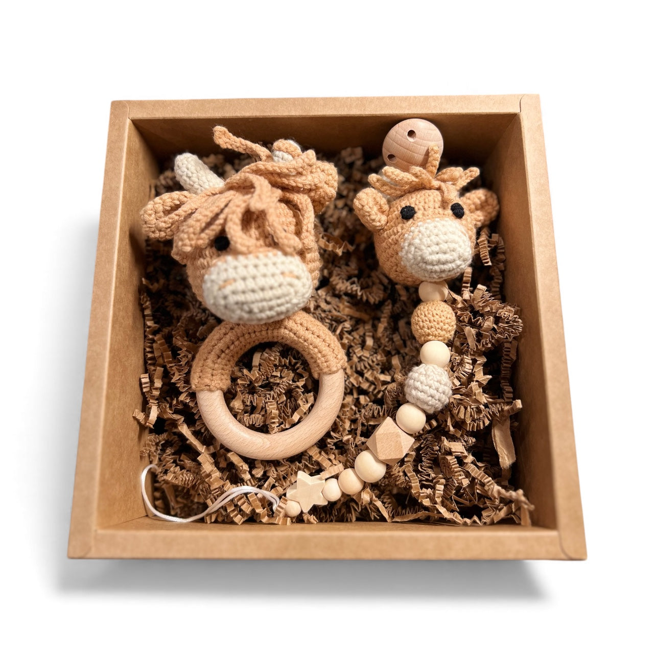 This charming gift set features an adorable highland cow rattle that’s easy for tiny hands to grasp and shake. Its soft textures engage babies' senses while encouraging motor skills development. The gentle sound of the rattle provides auditory stimulation, and the soother holder keeps pacifiers or the rattle close at hand, preventing them from getting lost. Made from baby-safe materials, this set ensures a safe and enjoyable experience. Perfect for baby showers or milestone celebrations, it offers both entertainment and a lovely keepsake for parents and their little ones.