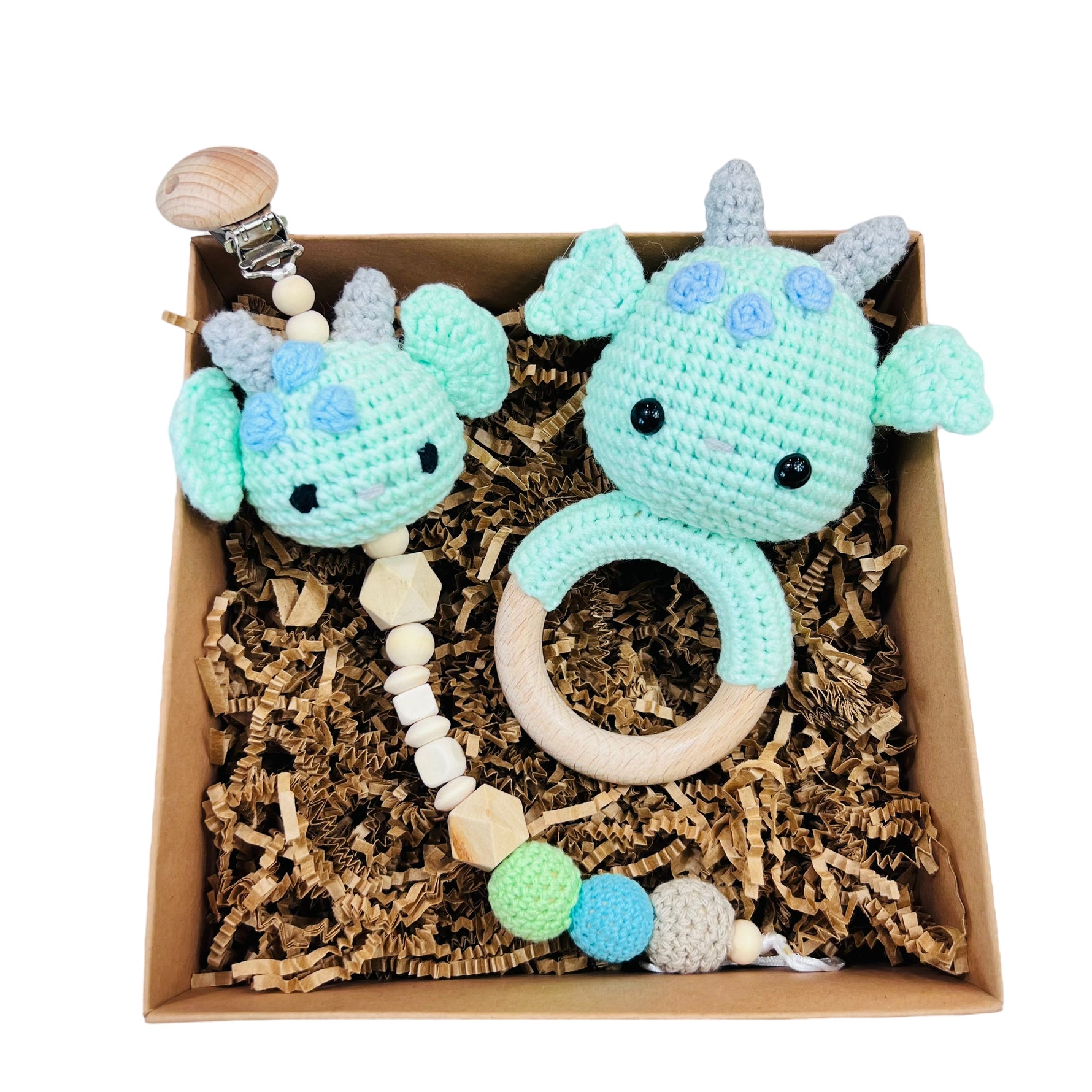 This charming crocheted gift set is perfect for your little one! It includes a delightful baby dragon rattle and a matching soother holder, both in soft pastel colors that add whimsy to any nursery. The rattle creates a gentle sound to captivate your baby's attention, while the soother holder keeps pacifiers and the rattle within easy reach, preventing them from getting lost. This set not only entertains and comforts but also serves as a lovely keepsake to cherish for years. It’s a delightful gift for baby showers or special occasions that both parents and babies will love!