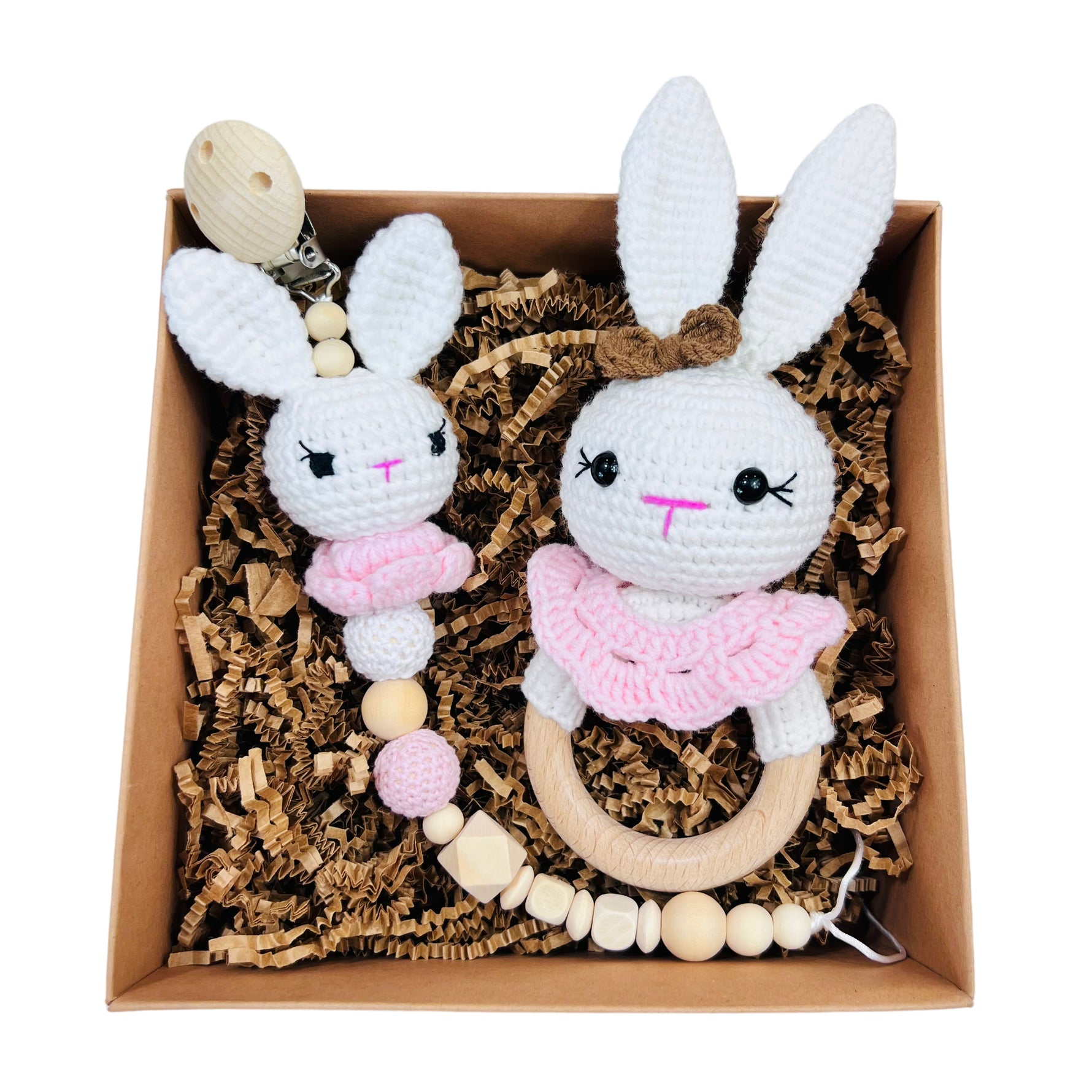 This charming crocheted gift set is perfect for little ones and includes a delightful bunny rattle and a matching soother holder. The colorful rattle captivates your baby's attention with its gentle sound, while the soother holder keeps pacifiers or the rattle easily accessible, preventing them from getting lost or dirty. This set not only provides comfort and entertainment but also serves as a lovely keepsake. Ideal for baby showers or special occasions, it’s sure to bring joy to both parents and their little ones.