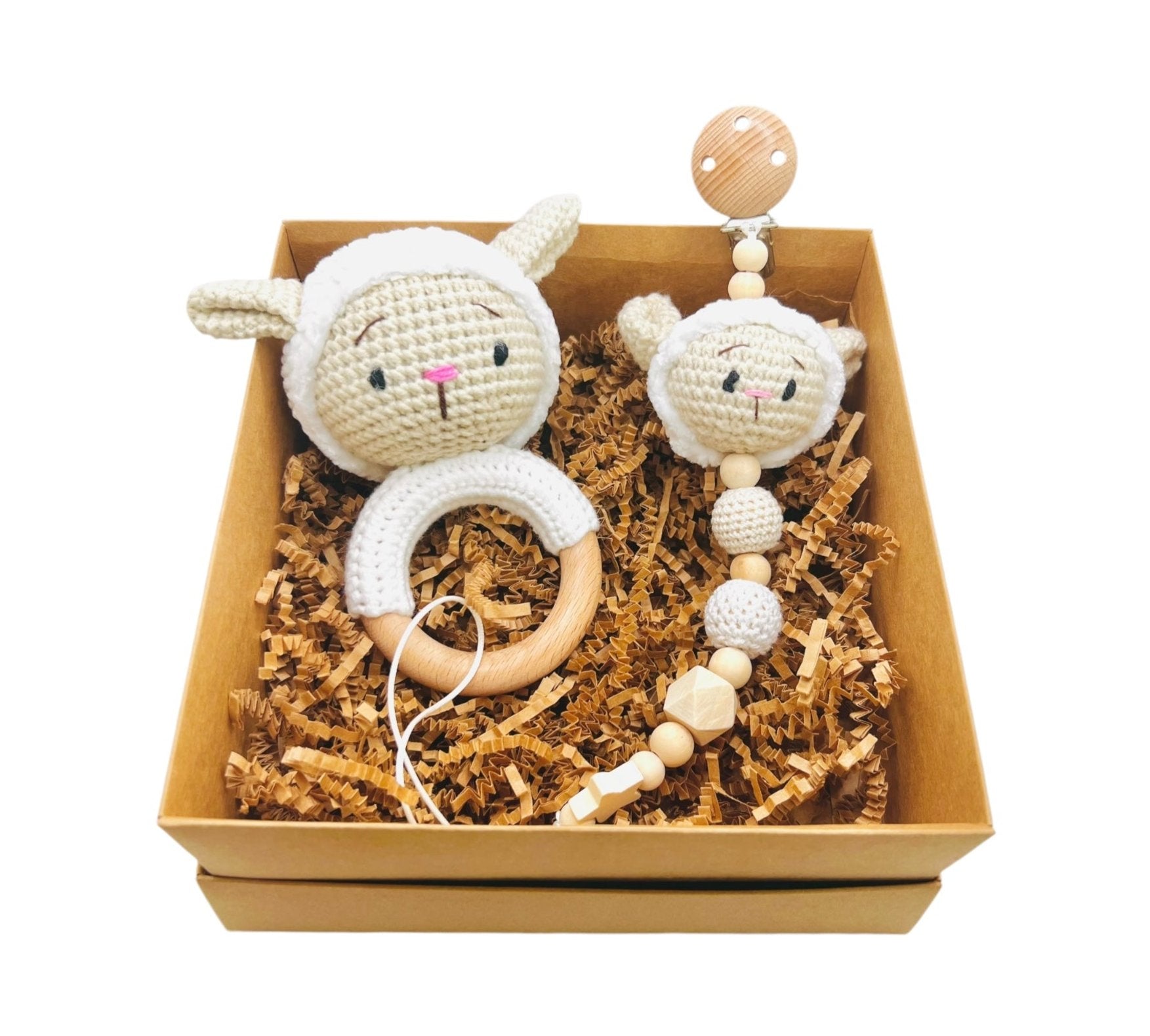 This charming gift set features an adorable lamb rattle that’s easy for tiny hands to grasp and shake. Its soft textures engage babies' senses while encouraging motor skills development. The gentle sound of the rattle provides auditory stimulation, and the soother holder keeps pacifiers or the rattle close at hand, preventing them from getting lost. Made from baby-safe materials, this set ensures a safe and enjoyable experience. Perfect for baby showers or milestone celebrations, it offers both entertainment and a lovely keepsake for parents and their little ones.