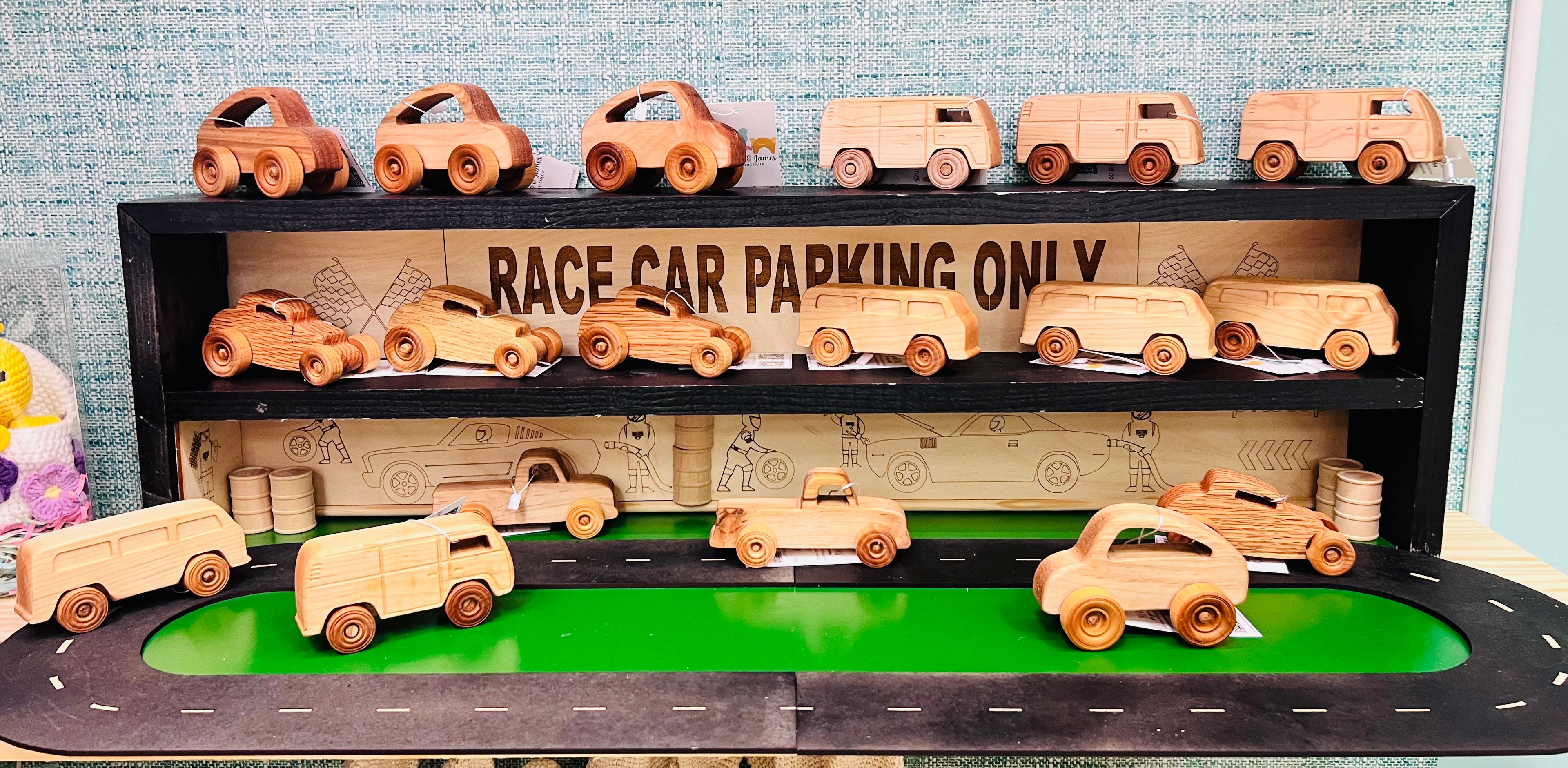 Our wooden cars are primarly made out of maple and walnut. We use beech wood for the ring on our rattles. We only use hard wood materials that are safe.